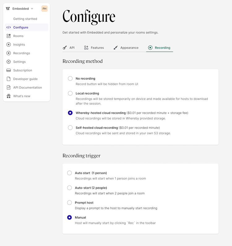Cloud recording and Whereby provided media storage is available for customers of all paid Embedded plans. In order to start recording Whereby sessions and store them in Whereby-provided cloud storage: