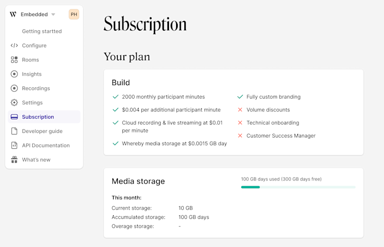 Whereby media storage included in your plan is available on a monthly basis. Any usage of Whereby storage above the included quota is charged at $0.0015 per GB per day, billed monthly.