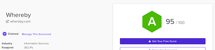 As of October 21st 2022*, Whereby scores very highly on SecurityScorecard, leading the embedded video space.