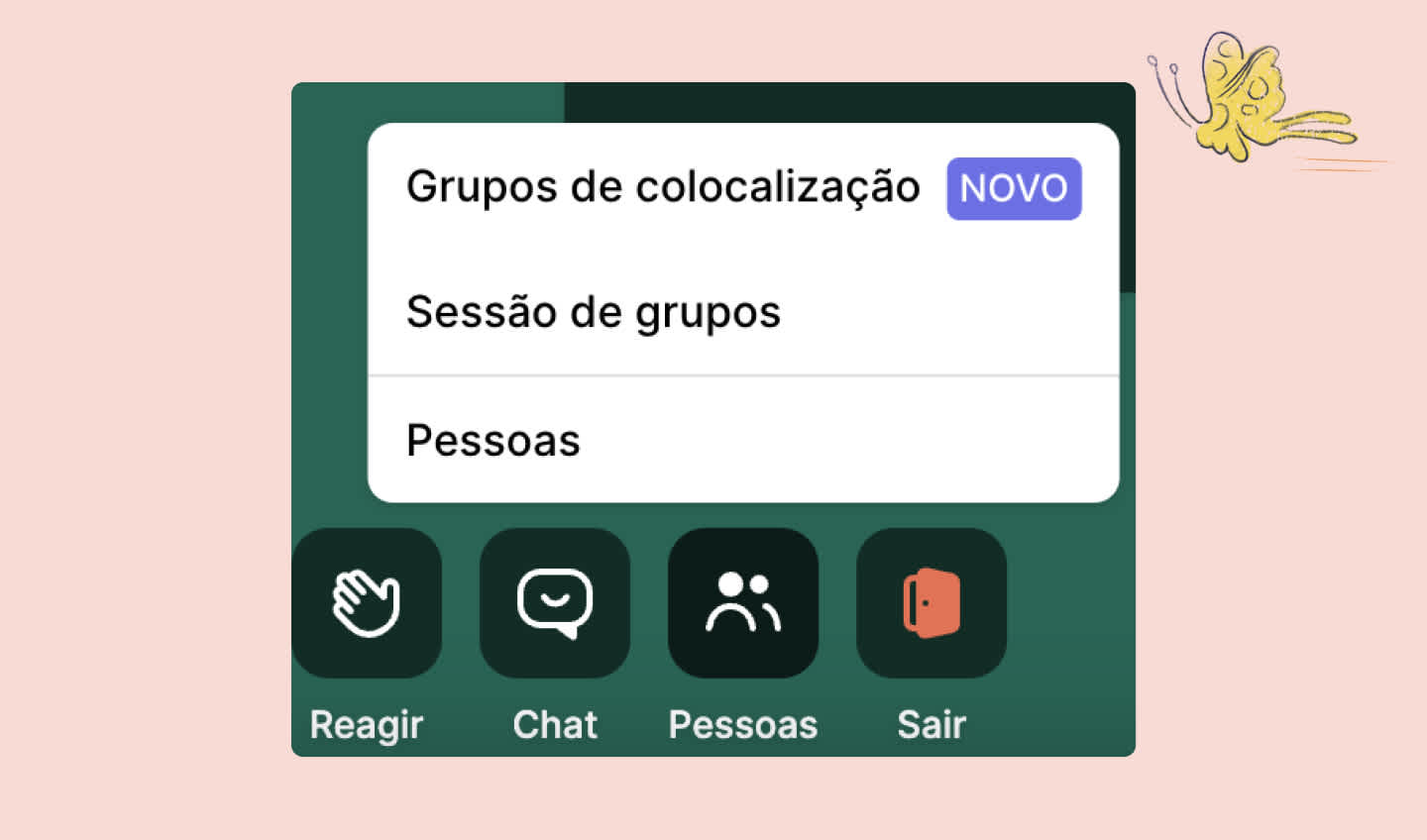 A diversão começa quando você entra na sua sala no Whereby! Temos muitos recursos úteis para tornar a sua reunião envolvente e produtiva.
