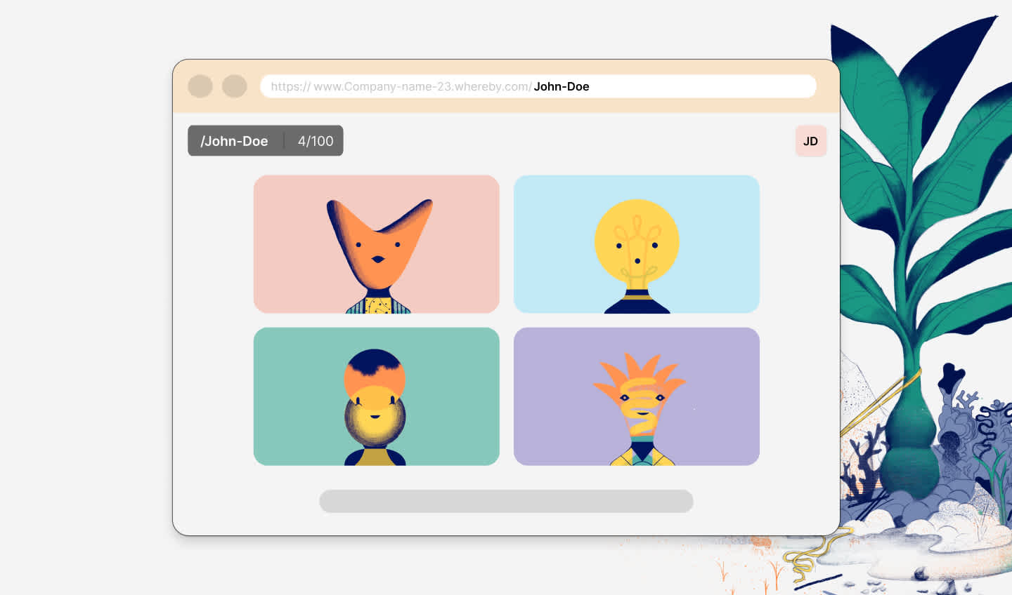 Cada uma das reuniões no Whereby ocorre numa “sala”. Essa sala tem seu próprio link personalizável que não muda (a menos que você o modifique, é claro). Criar a sua própria sala de reuniões é basicamente dar a você mesmo a propriedade do seu próprio espaço de reuniões virtual. Você poderá compartilhar o link para a sua sala de reuniões com um único clique para que as pessoas possam “bater na porta” e entrar na sua sala. Chega de links impossíveis de lembrar. Chega de links de reuniões novos para cada reunião. Apenas um espaço simples e pessoal para se conectar.