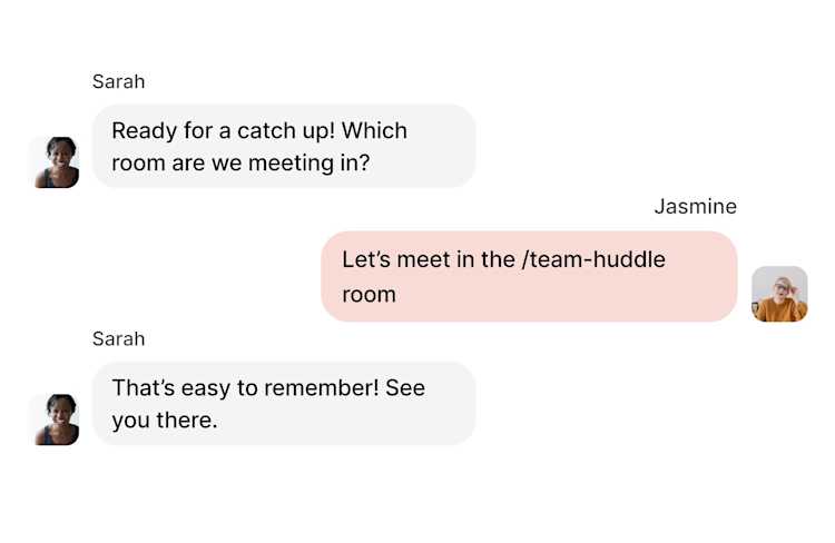 Custom URLs make it easy for you and your colleagues to identify which room you will be joining. The URLs can be easily shared with anyone via email, Slack or text message. By clicking on your link, your guests can join the meeting room immediately. The name is a great way to share with your guests what setting or room you’ll be meeting. Just as if you were at the office.
