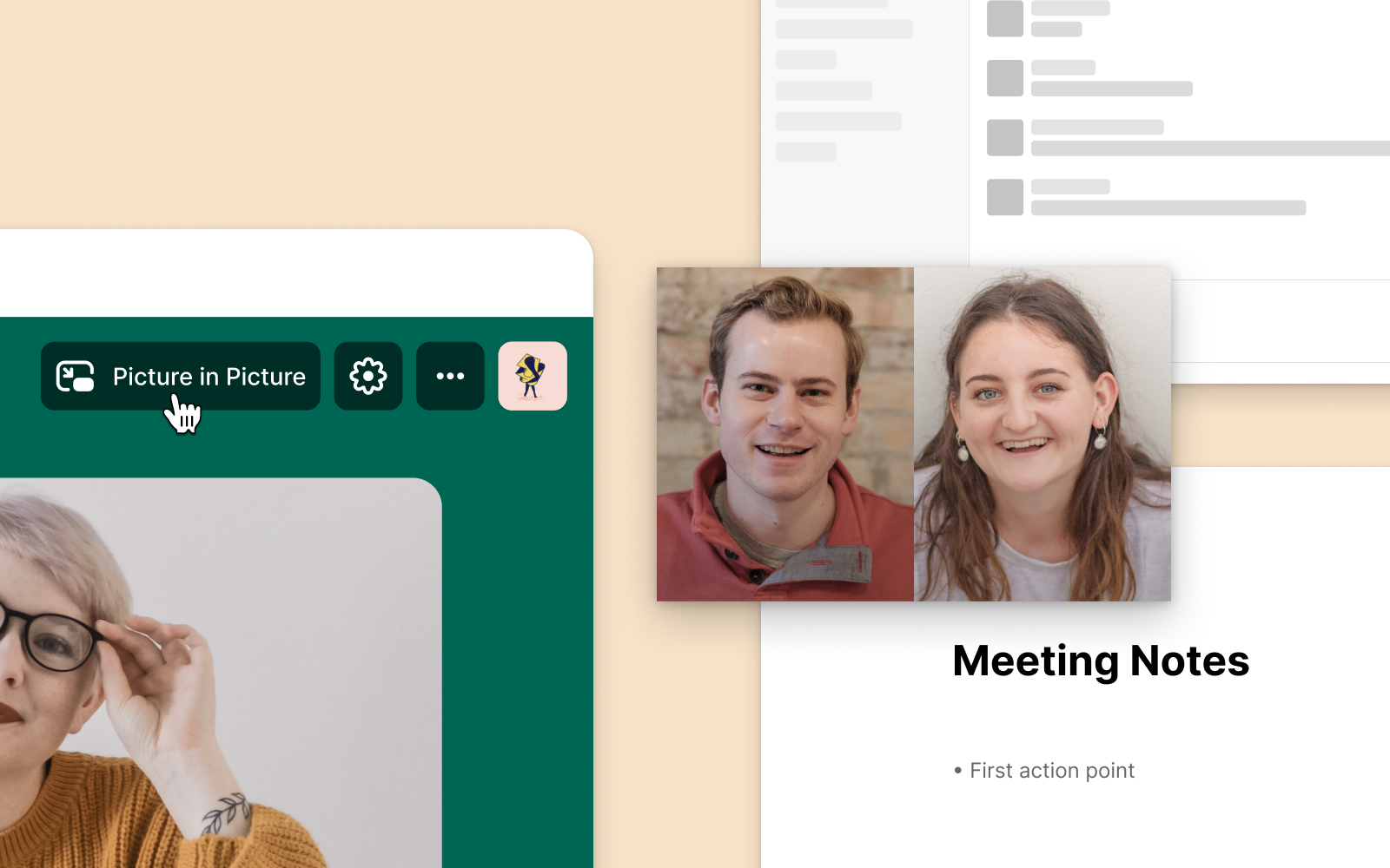 If you’re curious to try it out, you can enable Document Picture-in-Picture on any Whereby Embedded or Whereby Meetings room by appending the ?documentPipOn parameter to the room URL (replace the ? with & if you’re appending other parameters), like so: https://yoursubdomain.whereby.com/your_room?documentPipOn. You can see it in action by clicking the Picture-in-Picture button in the top right corner of a meeting room, or by starting a screen share.