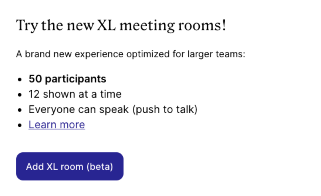 Extra Large rooms are still in Beta, meaning that we may make smaller tweaks to the experience without notice and you may experience bugs.