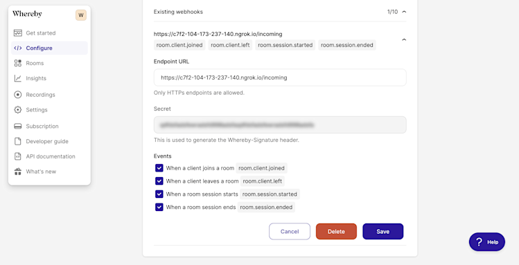 Log in to your Whereby Dashboard. You'll find the Webhooks configuration settings at the bottom of the Configure page. Enter the full URL in the Endpoint URL field (e.g. http://example.ngrok.io/incoming), and select the events for which you'd like to receive notifications.