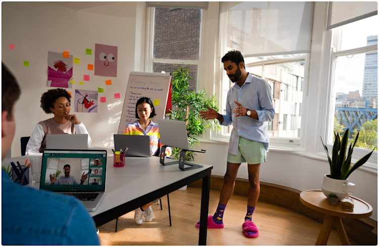 Having those in the meeting room squeezing around a single laptop or staring up at a conference room screen doesn’t make for an inclusive, efficient meeting. Try to ensure everyone has their own laptop with their own camera so that all participants, together or remote, have an equal standing in the meeting. That way, everyone can have a clear view of who is speaking, see facial expressions and feel part of the conversation.