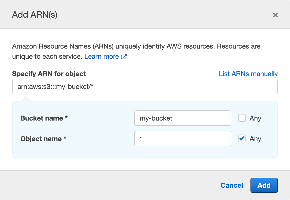 Setting the Bucket name and Object name, automatically sets the Amazon Resource Name or ARN for this policy. Your Resources pane should resemble the image below.
