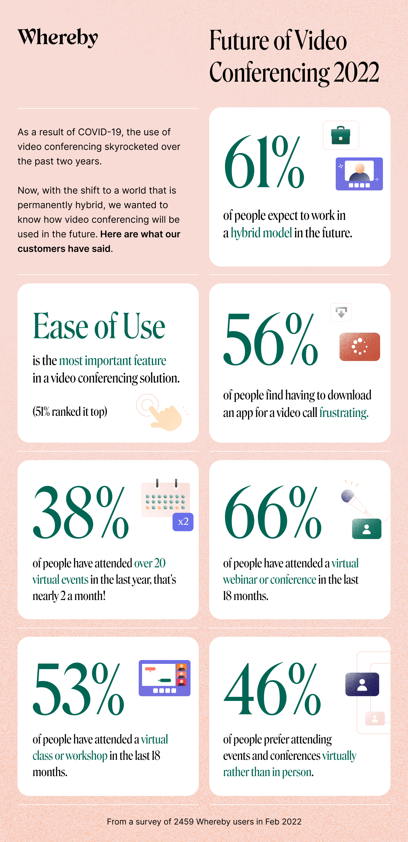 The use of video calls has become an integral part of businesses today - teachers are teaching students in online classrooms, patients can easily meet with their doctors, event organizers can host more accessible and inclusive events with the use of video. The world as we knew it has changed. So we wanted to find out what the future of video conferencing will hold. This infographic shows what our customers said.