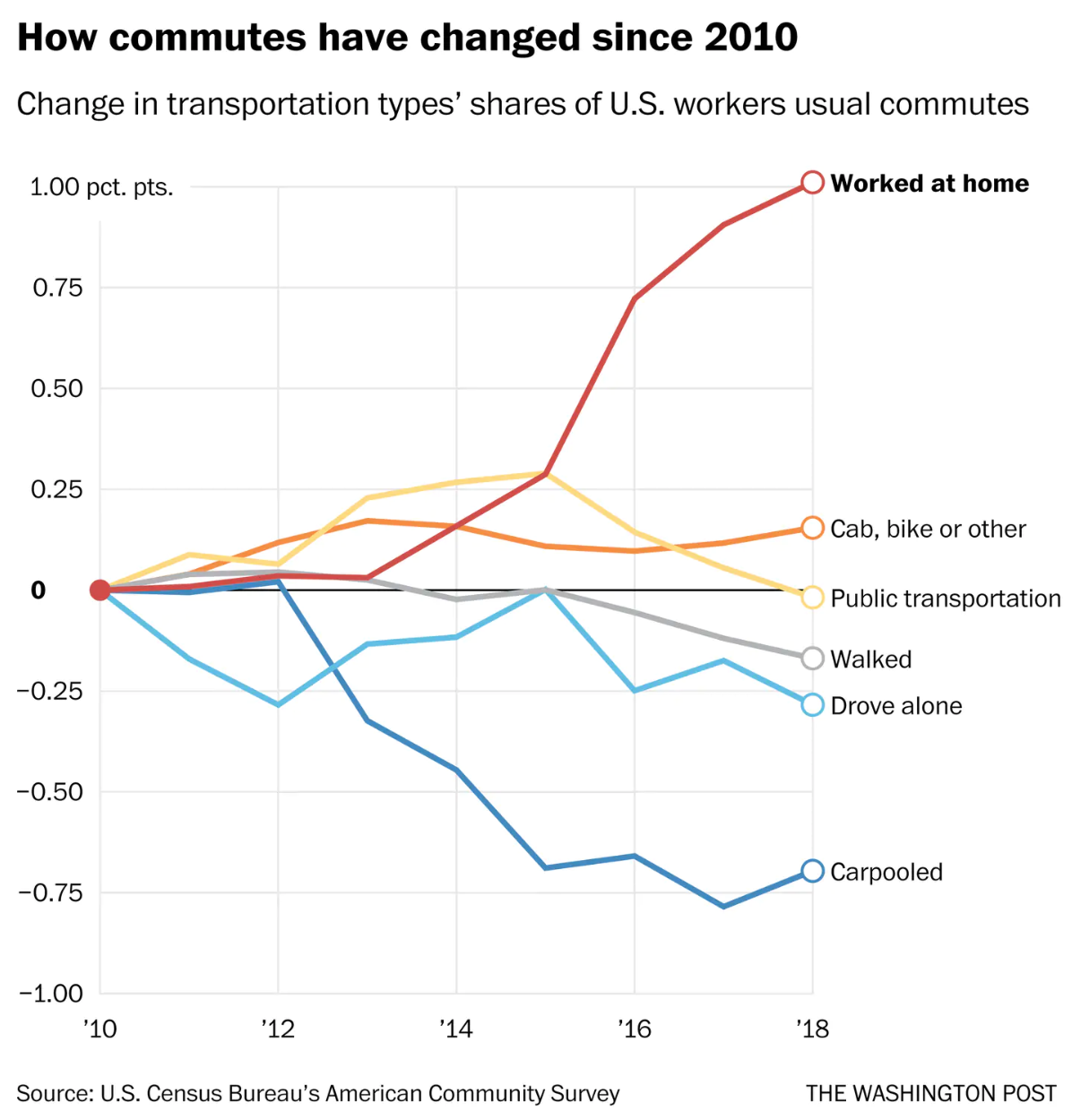 2019 has really been the year when remote and flexible work has hit the mainstream market. Recent studies have shown that 63% of US companies now have remote workers. Data from the U.S. Bureau of Labor Statistics showed that 29% of workers could work at home, and 25% (36 million) sometimes worked at home. 57% of workers had a flexible schedule in which they were able to vary the times they began and stopped working. When looking at changes in transportation, it's clear that the change is real: The fastest growing commute type is now no commute.