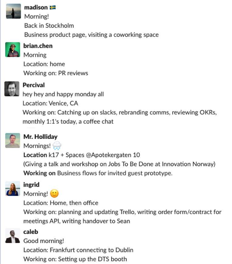 Our team has a routine that we start and end each day with: when each team member logs on in the morning and start working, they “check in” on chat by saying