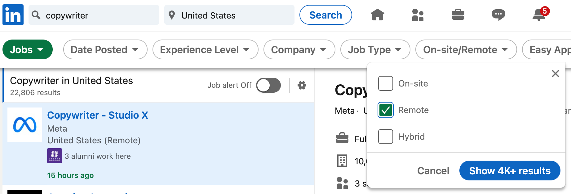 If you want to use LinkedIn to find a job where you can work from home, you can easily filter for Remote (or even Hybrid, if that floats your boat). Keep in mind that while a remote job often means you can work for companies in other countries, the world is still catching up with international remote employment. Make sure to take note of whether or not the company is seeking employees in your country before you apply.