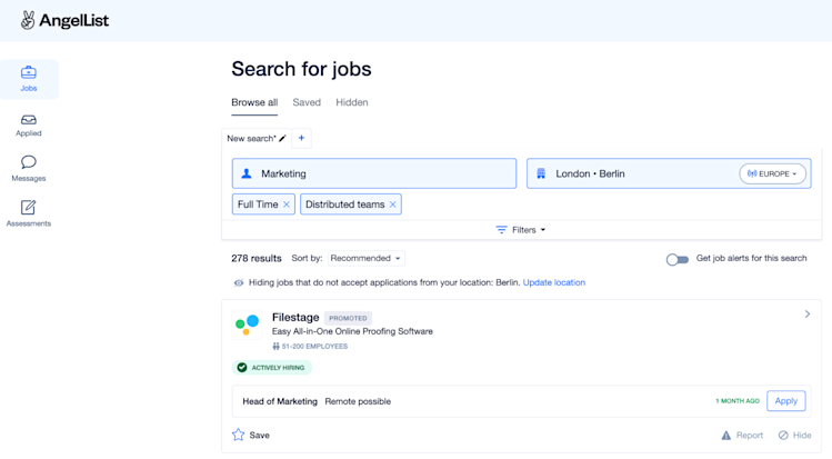 AngelList is a space for startups to list open positions. And while you may find that some companies are still hybrid or in-office, the vast majority are remote-first. You can toggle a filter to only show jobs that are remote, which will add “Distributed Teams” to your search.