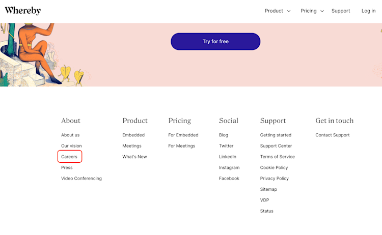 If you have your eye on a company that you know is remote, you may also want to browse directly on their site. We’re remote-first at Whereby, so we can use our website as an example. Most of the time, if you go to a company site, you can scroll to the footer and see “Careers.” This may also be under a “Jobs” or “Join us” heading.
