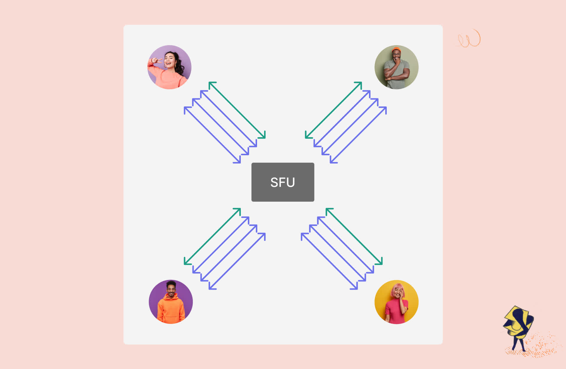 A Selective Forwarding Unit or SFU is a server that functions as a media router. You can think of it as being located in the middle of a group of participants in a video call. All participants securely connect to this central SFU, and it decides which video and audio to send securely onward to each participant.