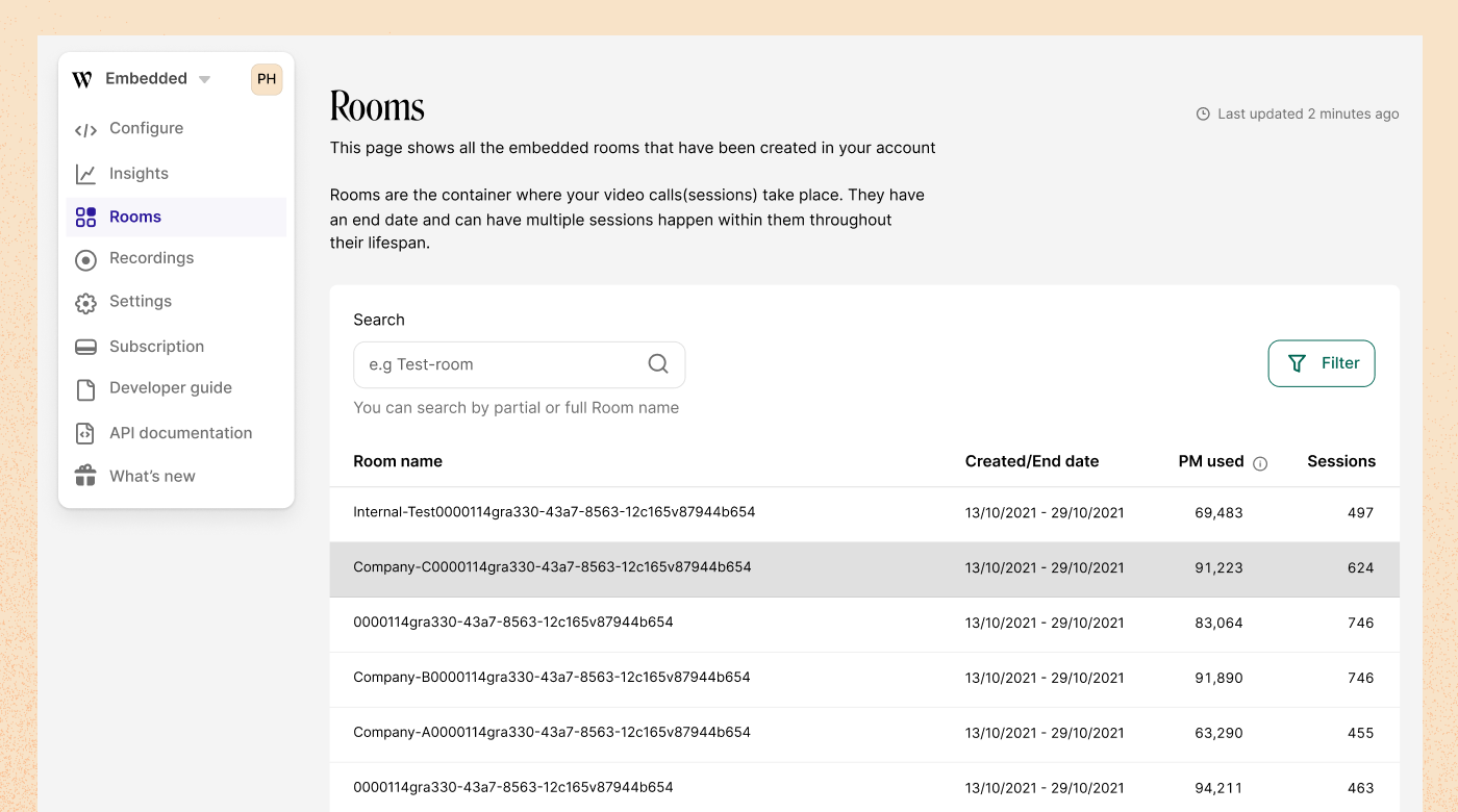 To help you get more insights, we’re adding Room specific data to the Insights Dashboard. You can dive deeper into your customers’ usage to understand how often the rooms are being used and how many participants join these rooms.