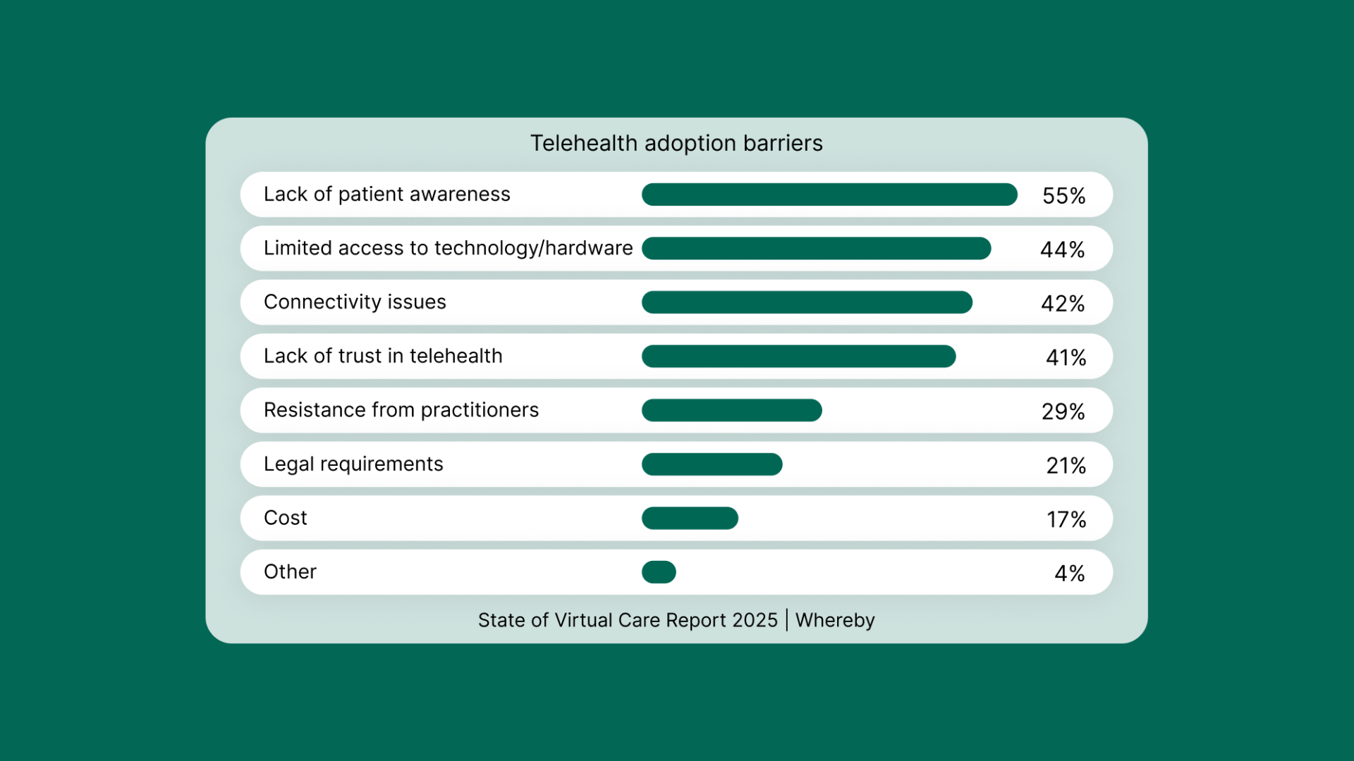 5. 44% cite limited access to technology, and 42% cite connectivity issues as the factors limiting telehealth adoption.