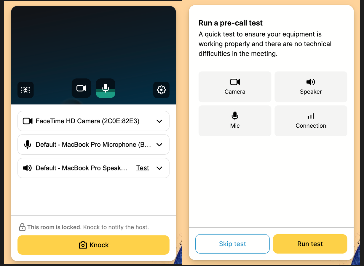 By embedding this URL parameter, ?precallCeremony=<on|off>, the simple wizard checks their microphone, camera, loudspeaker, and internet connection, ensuring they’re all set for the call. This helps resolve any issues, like a camera driver glitch, weak WiFi, or a dead pair of headphones, before the meeting starts.