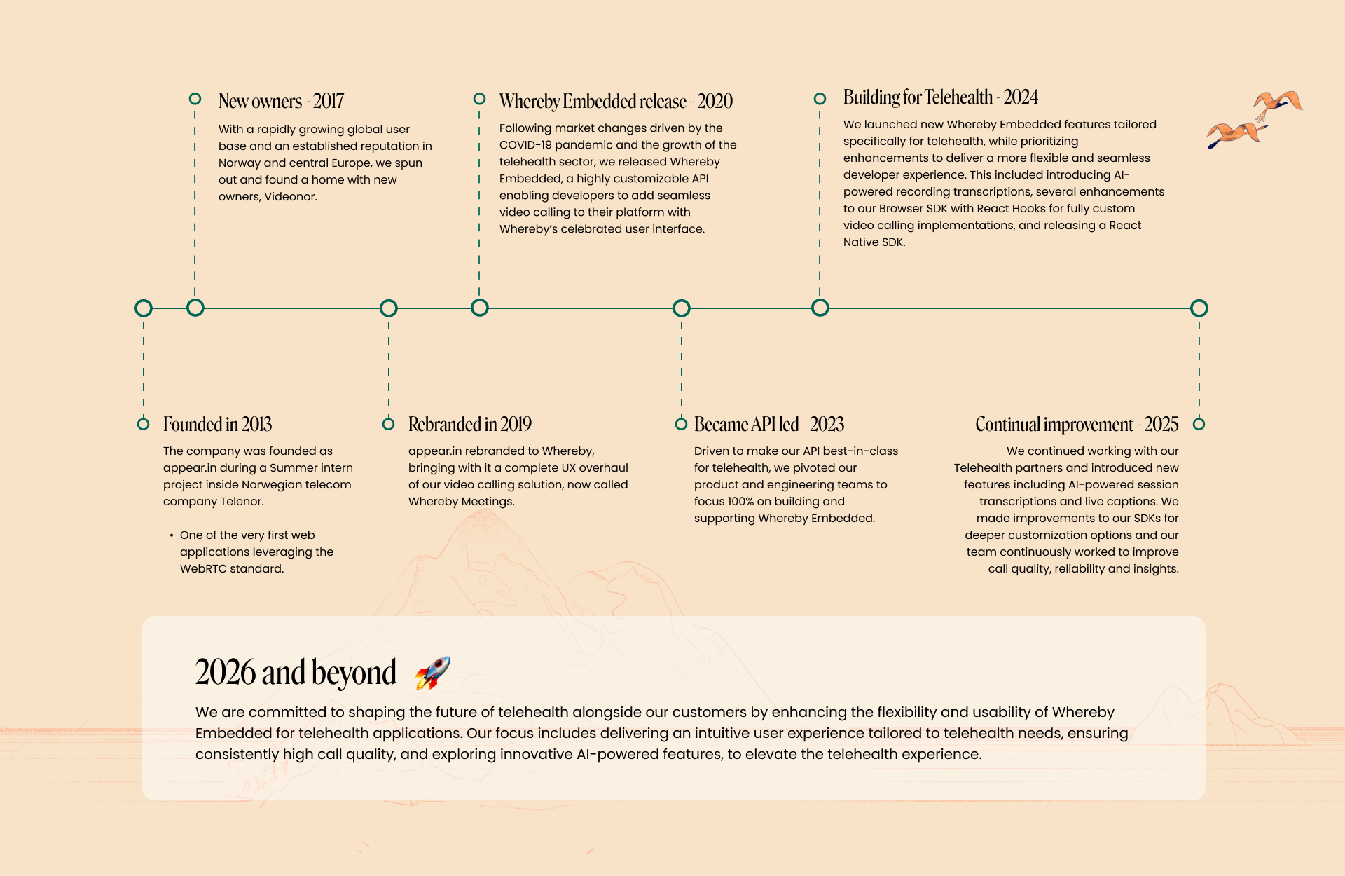 2023- Became API led: Driven to make our API best-in-class for telehealth, we pivoted our product and engineering teams to focus 100% on building and supporting Whereby Embedded.