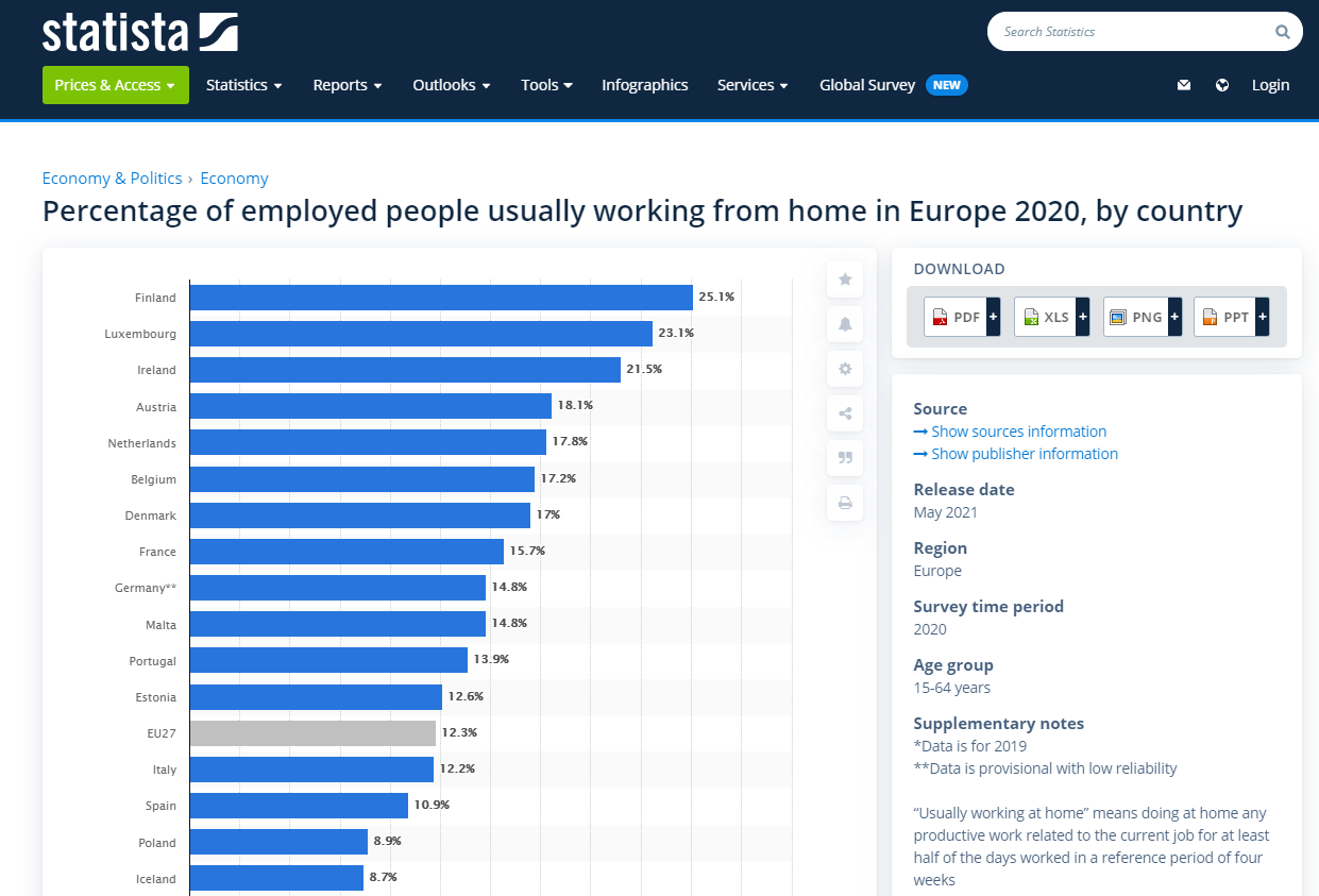 When we look at the EU as a whole, the percentage of people who work from home is much lower (12%), but some individual European countries do have levels of remote work that match the US, such as Finland (25%) and Luxembourg (23%).
